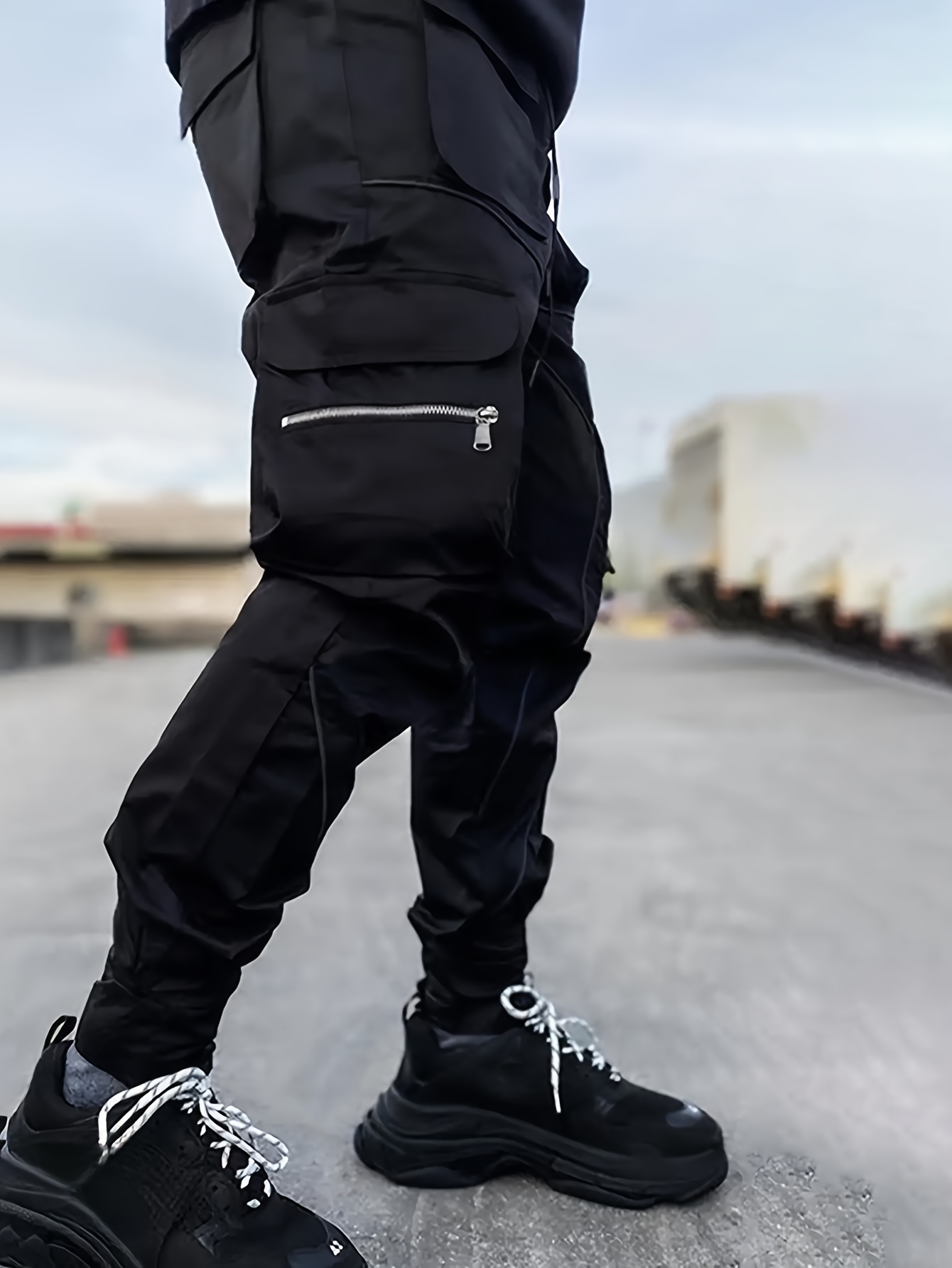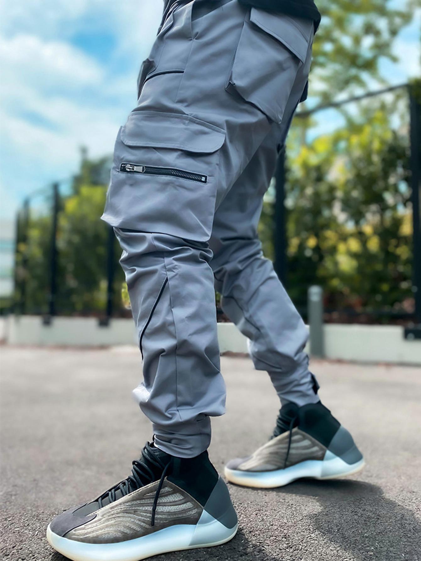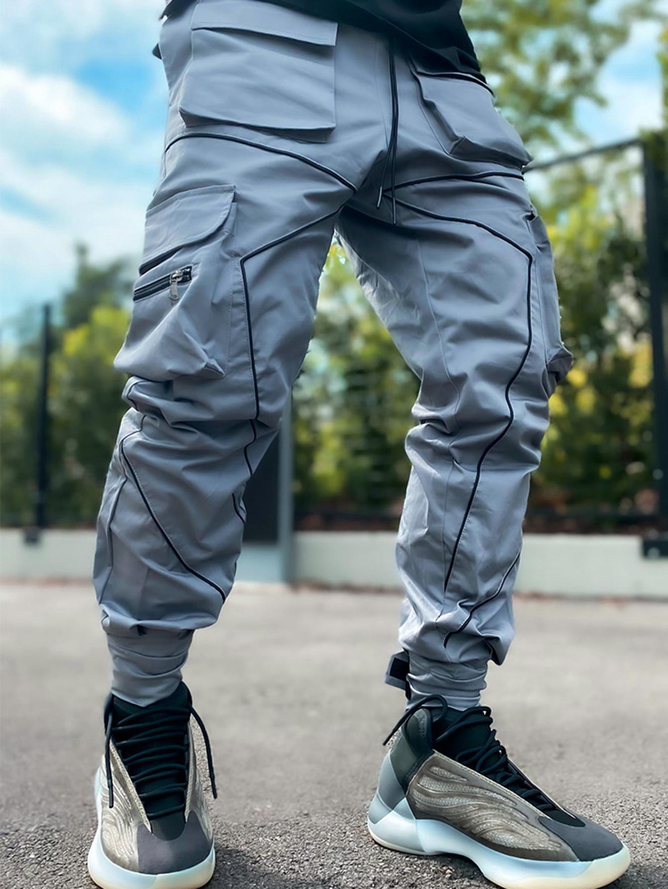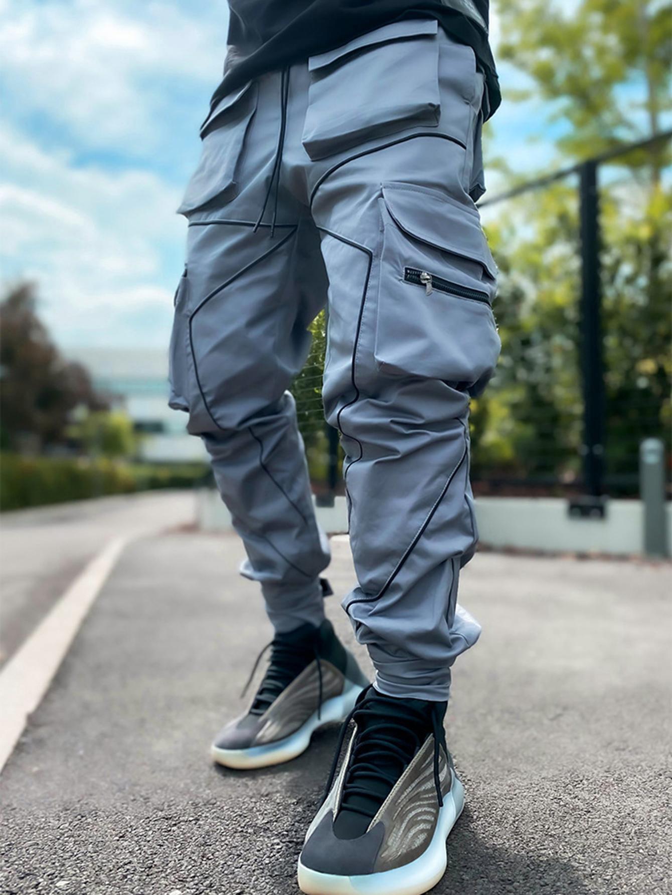TOOLUCK Men's autumn and winter loose straight casual overalls, multi-pocket cuffs and reflective sports pants