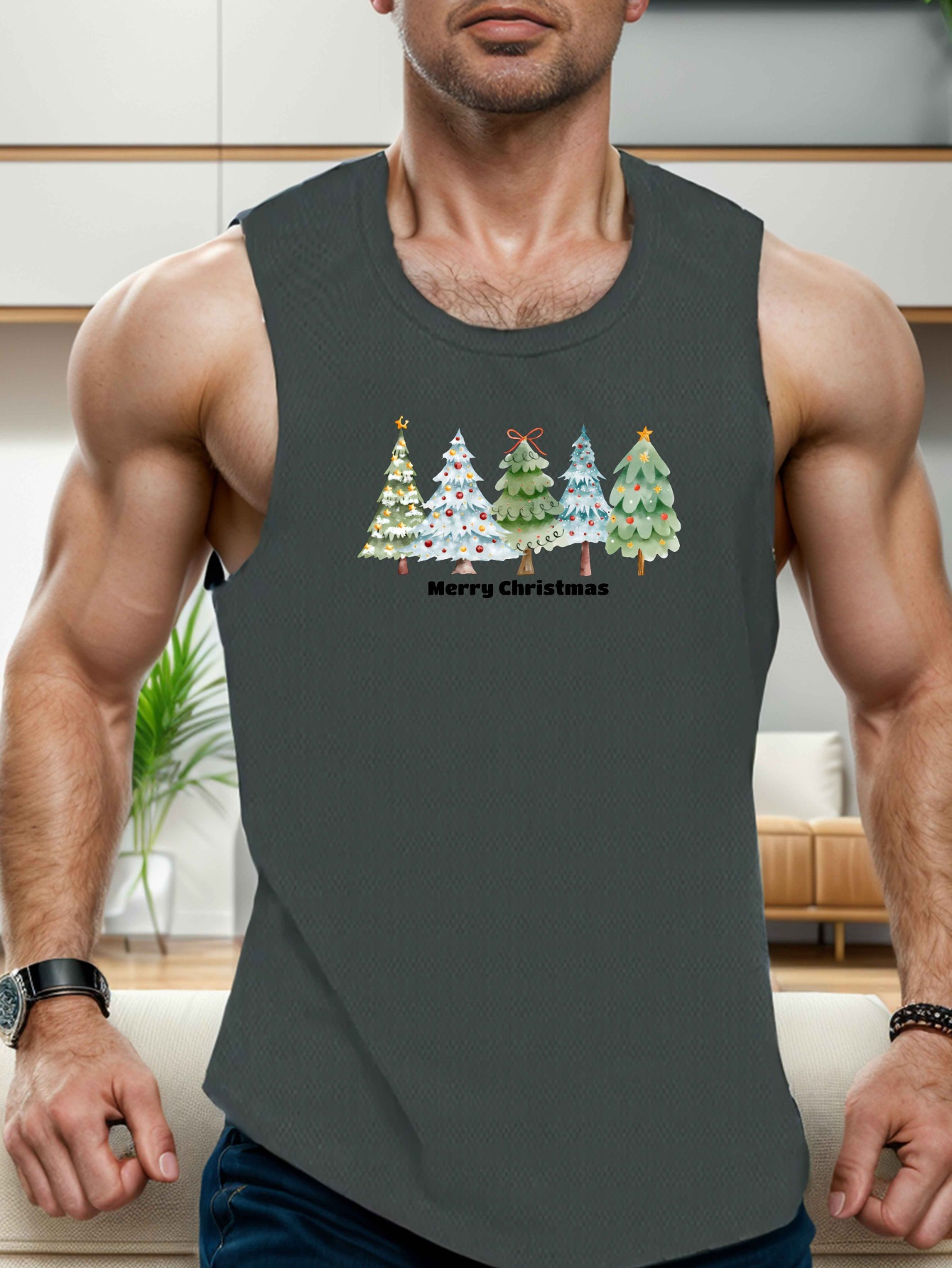 1pc Men'S Casual Christmas Tree Print Sleeveless Tank Top, Polyester Knit Round Neck Vest for Summer, Regular Fit Adult Tank