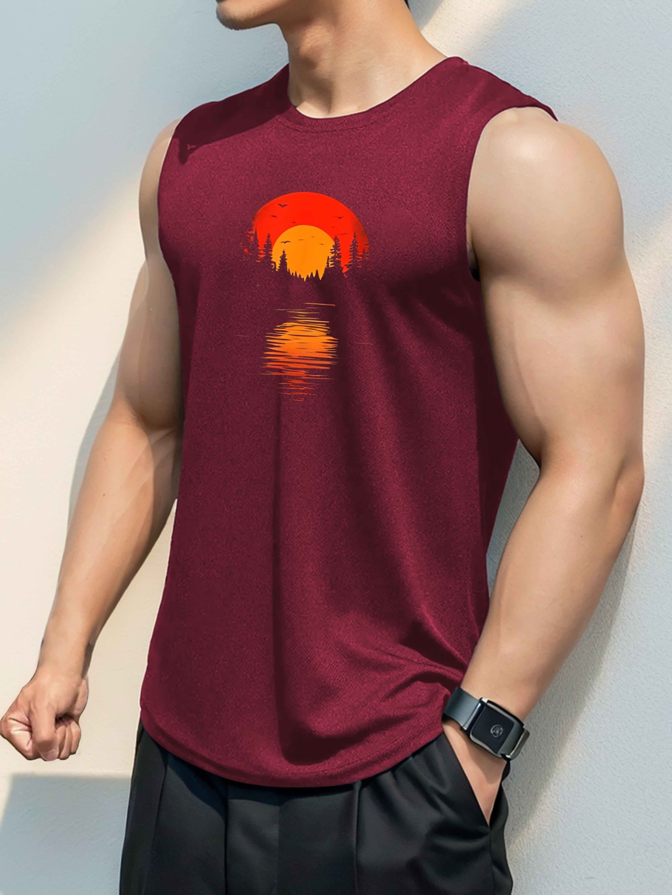Men'S Casual Crew Neck Tank Top, 100% Polyester Knit Fabric, Regular Fit, Geometric Sunset Pattern, Slight Stretch, for Summer Sleeveless Shirt